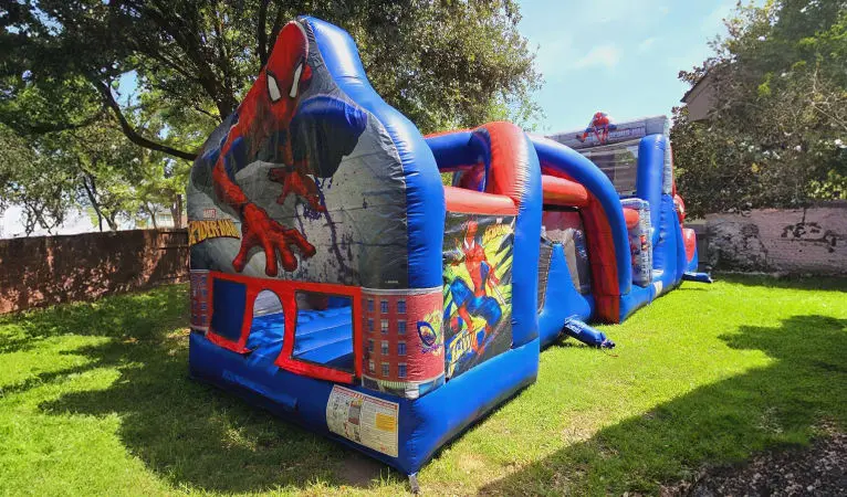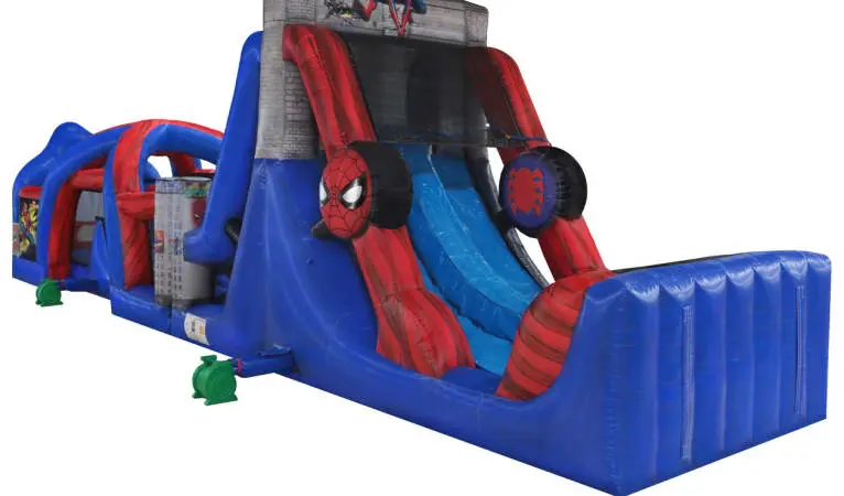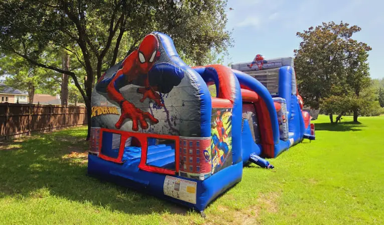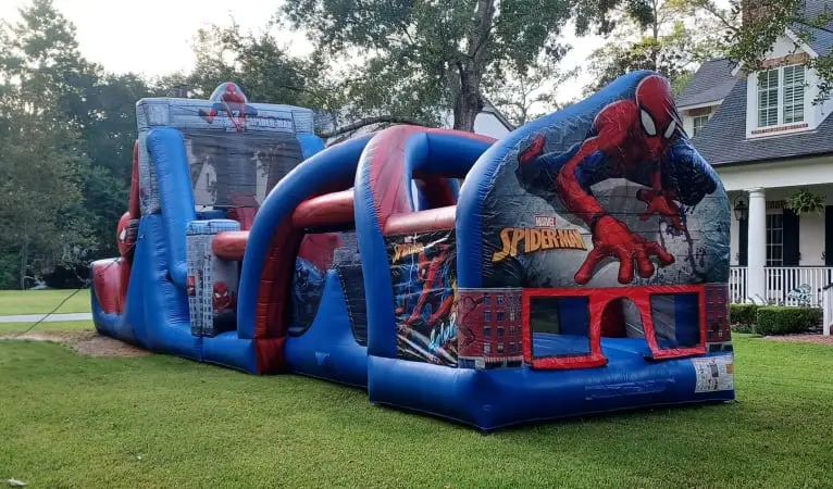 Perfect for birthday parties or backyard gatherings, the 50ft Spider Man Obstacle Course (Dry or Wet/Water Slide) is guaranteed to be a hit with kids of all ages.